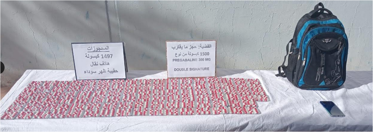 ليتم توقيفه واجراء عليه عملية تلمس جسدي وتفتيش حقيبته. أين تم العثور بداخلها على كمية من الأقراص المهلوسة قدرت بــ 1497 قرص مهلوس من نوع بريغابالين 300 ملغ.
