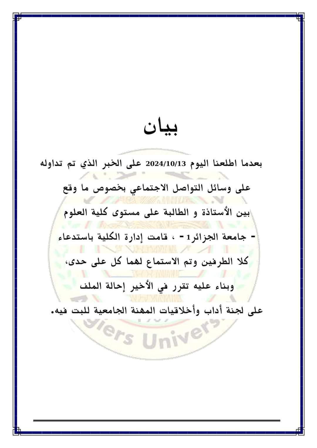 نشرت جامعة الجزائر 1، اليوم الأحد، بيانا حول واقعة الخلاف بين أستاذة وطالبة بكلية العلوم.