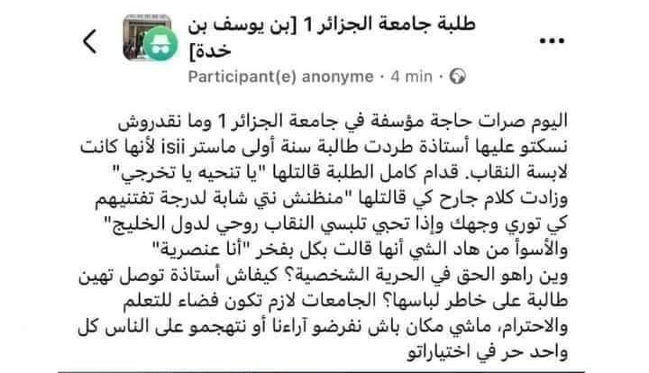 أنت تقرأ في المقال : إحالة قضية الخلاف بين الأستاذة والطالبة على لجنة آداب وأخلاقيات جامعة الجزائر 1