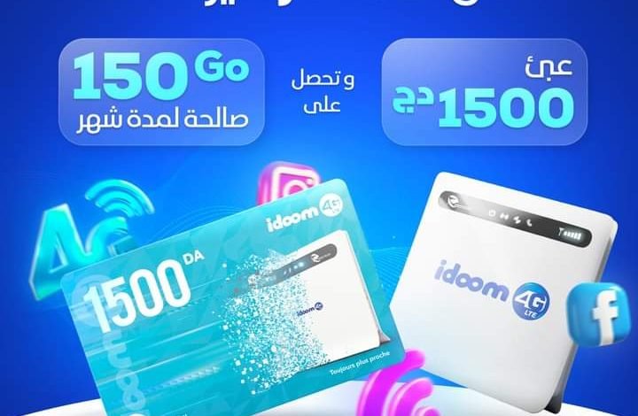 أعلنت اتصالات الجزائر عن عرض جديد ضمن عروض Idoom 4G، يمنح للمشتركين إمكانية الاتصال بالإنترنت في أي مكان وزمان. وحسب العرض، يمكن للمستخدمين التمتع بـ 150 جيغا من الإنترنت مقابل 1500 دج فقط، صالحة لمدة شهر كامل، لتقاسم التجربة مع الأصدقاء والعائلة بكل حرية.