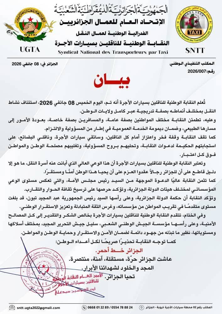 أعلنت النقابة الوطنية للناقلين بسيارات الأجرة، اليوم الخميس، عن استئناف نشاط النقل بمختلف أنماطه بشكل تدريجي في جميع ولايات الوطن.