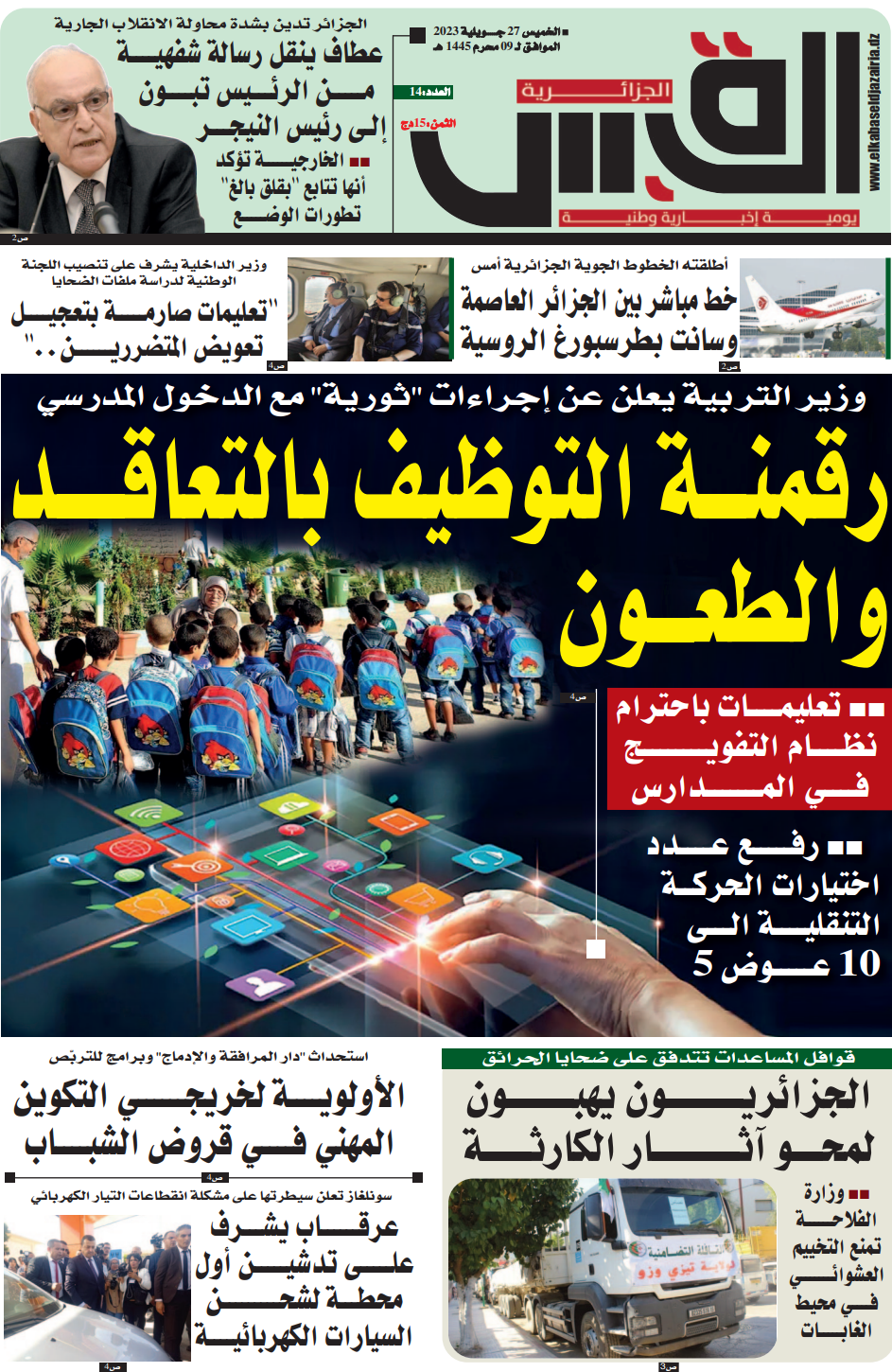 النسخة الورقية الخميس 27 جويلية 2023 اخر تحديث : 2023/07/30 على 1:27 صباحًا بواسطة haddoumH منذ 3 سنوات مضت شارك [wpdm_package id=’3064′] haddoumH 30 يوليو، 2023 28 يوليو، 2023 شارك هذه المقالة فيسبوك تويتر Whatsapp Whatsapp LinkedIn المقالة السابقة زيارة الرئيس الجزائري للصين… تعزيز وتعميق الشراكة الاستراتيجية الشاملة بين البلدين المقالة التالية إطلاق نار على قاضي تحقيق بمكتبه في مستغانم.. ونقابة القضاة تستنكر اترك تعليقا اترك تعليقاً إلغاء الردلن يتم نشر عنوان بريدك الإلكتروني. الحقول الإلزامية مشار إليها بـ *التعليق * الاسم * البريد الإلكتروني * الموقع الإلكتروني احفظ اسمي، بريدي الإلكتروني، والموقع الإلكتروني في هذا المتصفح لاستخدامها المرة المقبلة في تعليقي. أحدث التعليقاتتيسمسيلت: توقيف شبكة إجرامية بحوزتها 5739 قرص…8 يناير 2026756 viewsالفاف يتقدم بشكوى رسمية إلى الكاف والفيفا11 يناير 2026702 viewsالحارس الدولي أسامة بن بوط يعلن اعتزاله…12 يناير 2026686 viewsأحدث التعليقات