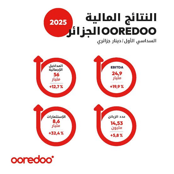 وحسب بيان للمؤسسة، فقد واصلت “أوريدو الجزائر” مسارها التصاعدي، محققة نمواً برقمين من ناحية رقم أعمالها وفي مؤشر الأرباح قبل احتساب الفوائد والضرائب والاستهلاك والإطفاء EBITDA، حيث بلغ رقم الأعمال 56 مليار دينار جزائري، مقابل 49.7 مليار دينار جزائري خلال نفس الفترة من سنة 2024، أي بزيادة قدرها 12.7٪.