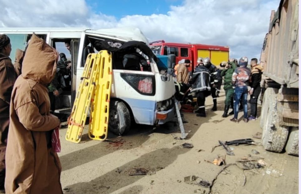 وحسب مصالح الحماية المدنية، تدخلت مصالحها على الساعة 11سا10د من أجل حادث اصطدام بين شاحنة و حافلة لنقل المسافرين ،بالطريق الإجتنابي للوزن الثقيل الوطواط رقم 01 ، بلدية ودائرة تيسمسيلت.