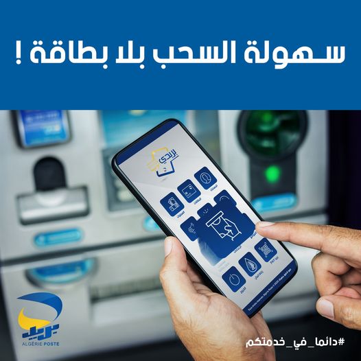 نشرت مؤسسة بريد الجزائر خدمة جديدة حول السحب بدون بطاقة بكل سهولة عبر الشبابيك الآلية لبريد الجزائر. وأوضحت بريد الجزائر في بيان نشرته عبر صفحتها على فيسبوك. “استفيدوا من خدمة السحب بدون بطاقة “CARDLESS”. بكل سهولة عبر الشبابيك الآلية لبريد الجزائر”. ونشرت بريد الجزائر رابطاً لتحميل التطبيق: https://play.google.com/store/apps/details