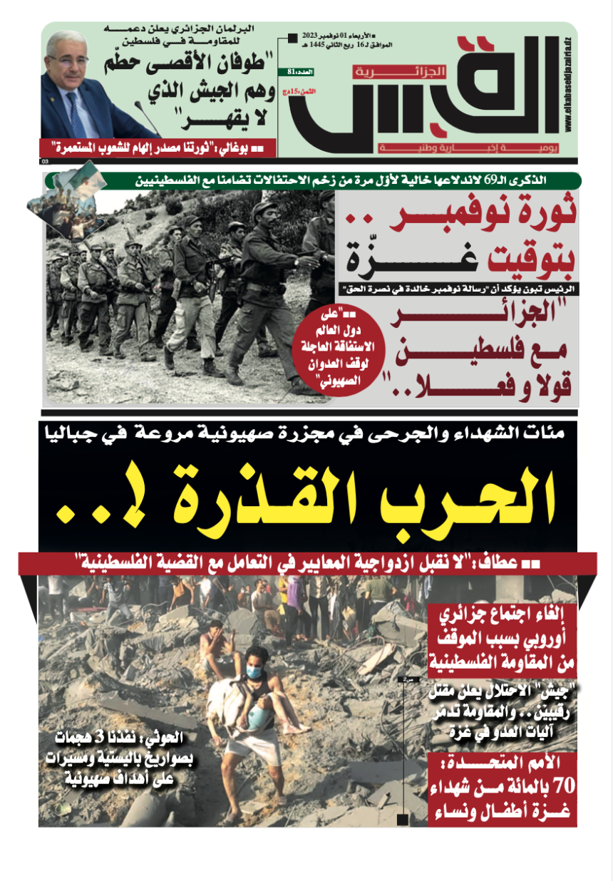 النسخة الورقية عدد – 1-11-2023 اخر تحديث : 2023/10/31 على 9:58 مساءً بواسطة القبس الجزائرية/وكالات منذ سنتين مضت شارك [wpdm_package id=’6170′] القبس الجزائرية/وكالات 31 أكتوبر، 2023 31 أكتوبر، 2023 شارك هذه المقالة فيسبوك تويتر Whatsapp Whatsapp LinkedIn المقالة السابقة “القبس” تنفرد بنشر كل التفاصيل حول مسابقات الدكتوراه المقالة التالية بعد قطع بوليفيا لعلاقاتها مع الكيان.. دولتان تستدعيان سفيريهما للتشاور اترك تعليقا اترك تعليقاً إلغاء الردلن يتم نشر عنوان بريدك الإلكتروني. الحقول الإلزامية مشار إليها بـ *التعليق * الاسم * البريد الإلكتروني * الموقع الإلكتروني احفظ اسمي، بريدي الإلكتروني، والموقع الإلكتروني في هذا المتصفح لاستخدامها المرة المقبلة في تعليقي. أحدث التعليقاتتيسمسيلت: توقيف شبكة إجرامية بحوزتها 5739 قرص…8 يناير 2026779 viewsالفاف يتقدم بشكوى رسمية إلى الكاف والفيفا11 يناير 2026723 viewsالحارس الدولي أسامة بن بوط يعلن اعتزاله…12 يناير 2026708 viewsأحدث التعليقات
