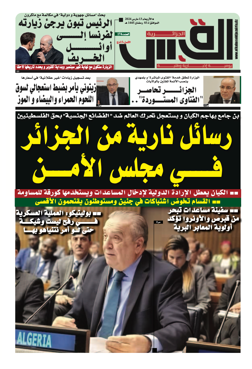 النسخة الورقية عدد 13-03-2024 اخر تحديث : 2024/03/12 على 10:24 مساءً بواسطة القبس الجزائرية/وكالات منذ سنتين مضت شارك [wpdm_package id=’9278′] القبس الجزائرية/وكالات 12 مارس، 2024 12 مارس، 2024 شارك هذه المقالة فيسبوك تويتر Whatsapp Whatsapp LinkedIn المقالة السابقة عون يشارك في منتدى للشركات المتوسطة بألمانيا المقالة التالية وزارة الشؤون الدينية تعلن عن اطلاق خدمة ”الفتوى المباشرة” اترك تعليقا اترك تعليقاً إلغاء الردلن يتم نشر عنوان بريدك الإلكتروني. الحقول الإلزامية مشار إليها بـ *التعليق * الاسم * البريد الإلكتروني * الموقع الإلكتروني احفظ اسمي، بريدي الإلكتروني، والموقع الإلكتروني في هذا المتصفح لاستخدامها المرة المقبلة في تعليقي. أحدث التعليقاتتيسمسيلت: توقيف شبكة إجرامية بحوزتها 5739 قرص…8 يناير 2026758 viewsالفاف يتقدم بشكوى رسمية إلى الكاف والفيفا11 يناير 2026705 viewsالحارس الدولي أسامة بن بوط يعلن اعتزاله…12 يناير 2026688 viewsأحدث التعليقات