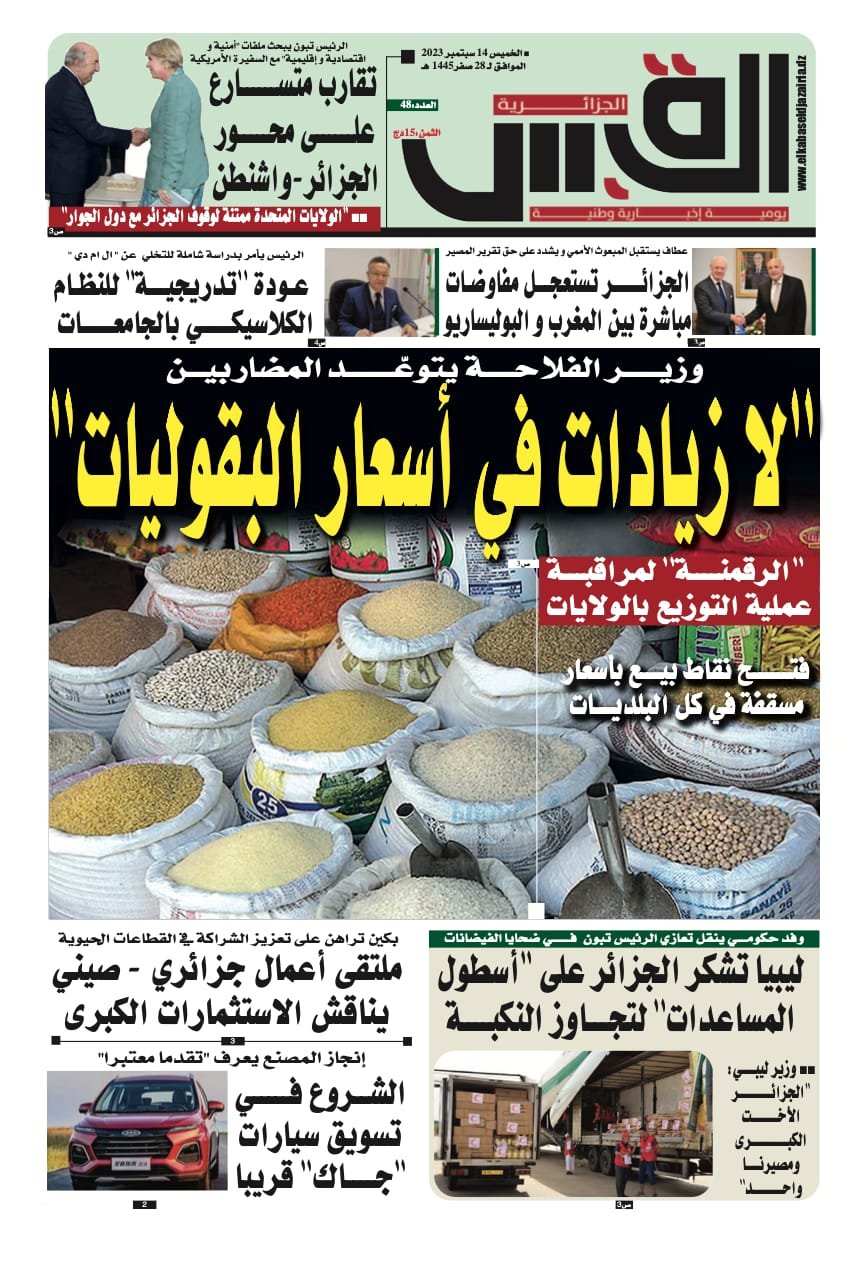 النسخة الورقية عدد 14-09-2023 اخر تحديث : 2023/09/13 على 9:47 مساءً بواسطة القبس الجزائرية/وكالات منذ سنتين مضت شارك [wpdm_package id=’4235′] القبس الجزائرية/وكالات 13 سبتمبر، 2023 13 سبتمبر، 2023 شارك هذه المقالة فيسبوك تويتر Whatsapp Whatsapp LinkedIn المقالة السابقة الكونغرس المكسيكي يعرض جثث “كائنات غير بشرية”يعتقد أن عمرها يتجاوز 1000 عام !! المقالة التالية تنظيم المنتدى الجزائري الأمريكي حول الطاقة من 7 الى 9 نوفمبر بواشنطن اترك تعليقا اترك تعليقاً إلغاء الردلن يتم نشر عنوان بريدك الإلكتروني. الحقول الإلزامية مشار إليها بـ *التعليق * الاسم * البريد الإلكتروني * الموقع الإلكتروني احفظ اسمي، بريدي الإلكتروني، والموقع الإلكتروني في هذا المتصفح لاستخدامها المرة المقبلة في تعليقي. أحدث التعليقاتتيسمسيلت: توقيف شبكة إجرامية بحوزتها 5739 قرص…8 يناير 2026766 viewsالفاف يتقدم بشكوى رسمية إلى الكاف والفيفا11 يناير 2026712 viewsالحارس الدولي أسامة بن بوط يعلن اعتزاله…12 يناير 2026695 viewsأحدث التعليقات