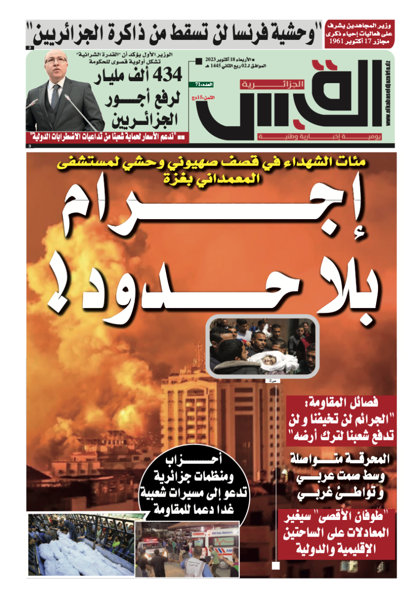 النسخة الورقية عدد 18-10-2023 اخر تحديث : 2023/10/17 على 9:51 مساءً بواسطة القبس الجزائرية/وكالات منذ سنتين مضت شارك [wpdm_package id=’5471′] القبس الجزائرية/وكالات 17 أكتوبر، 2023 17 أكتوبر، 2023 شارك هذه المقالة فيسبوك تويتر Whatsapp Whatsapp LinkedIn المقالة السابقة الجزائر تدعو إلى هبة دولية عاجلة لنجدة الشعب الفلسطيني المقالة التالية “لماذا تتلعثم..!” المفكر محمد حجاب يُمرس بييرس مورغان بشأن الصراع بين اسرائيل وفلسطين اترك تعليقا اترك تعليقاً إلغاء الردلن يتم نشر عنوان بريدك الإلكتروني. الحقول الإلزامية مشار إليها بـ *التعليق * الاسم * البريد الإلكتروني * الموقع الإلكتروني احفظ اسمي، بريدي الإلكتروني، والموقع الإلكتروني في هذا المتصفح لاستخدامها المرة المقبلة في تعليقي. أحدث التعليقاتتيسمسيلت: توقيف شبكة إجرامية بحوزتها 5739 قرص…8 يناير 2026761 viewsالفاف يتقدم بشكوى رسمية إلى الكاف والفيفا11 يناير 2026708 viewsالحارس الدولي أسامة بن بوط يعلن اعتزاله…12 يناير 2026691 viewsأحدث التعليقات