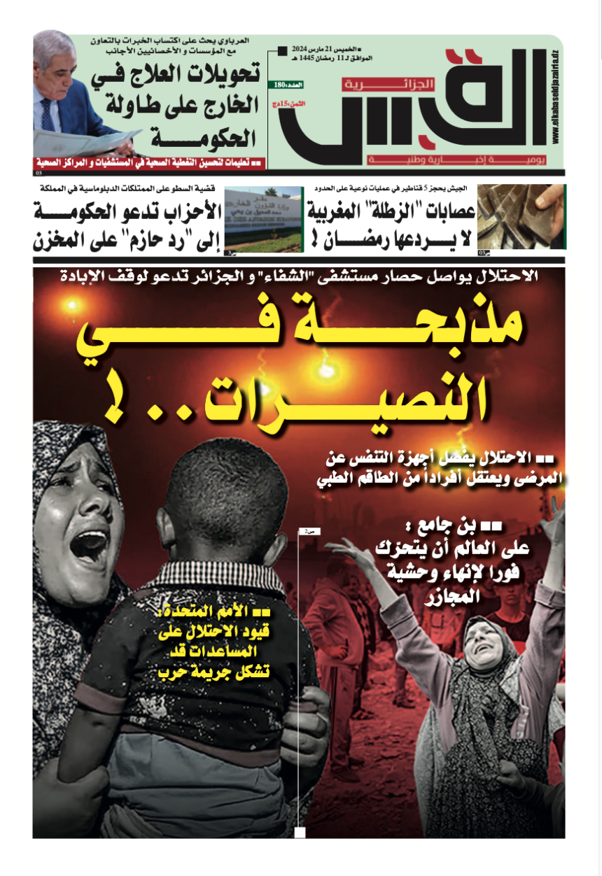 النسخة الورقية عدد 21-03 – 2024 اخر تحديث : 2024/03/21 على 11:58 مساءً بواسطة القبس الجزائرية/وكالات منذ سنتين مضت شارك [wpdm_package id=’9376′] القبس الجزائرية/وكالات 21 مارس، 2024 21 مارس، 2024 شارك هذه المقالة فيسبوك تويتر Whatsapp Whatsapp LinkedIn المقالة السابقة عدد 20 – 03 – 2024 المقالة التالية بلعريبي يتابع سيرورة رقمنة قطاعه وهذا ما أوصى به اترك تعليقا اترك تعليقاً إلغاء الردلن يتم نشر عنوان بريدك الإلكتروني. الحقول الإلزامية مشار إليها بـ *التعليق * الاسم * البريد الإلكتروني * الموقع الإلكتروني احفظ اسمي، بريدي الإلكتروني، والموقع الإلكتروني في هذا المتصفح لاستخدامها المرة المقبلة في تعليقي. أحدث التعليقاتتيسمسيلت: توقيف شبكة إجرامية بحوزتها 5739 قرص…8 يناير 2026763 viewsالفاف يتقدم بشكوى رسمية إلى الكاف والفيفا11 يناير 2026709 viewsالحارس الدولي أسامة بن بوط يعلن اعتزاله…12 يناير 2026692 viewsأحدث التعليقات
