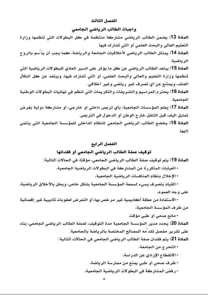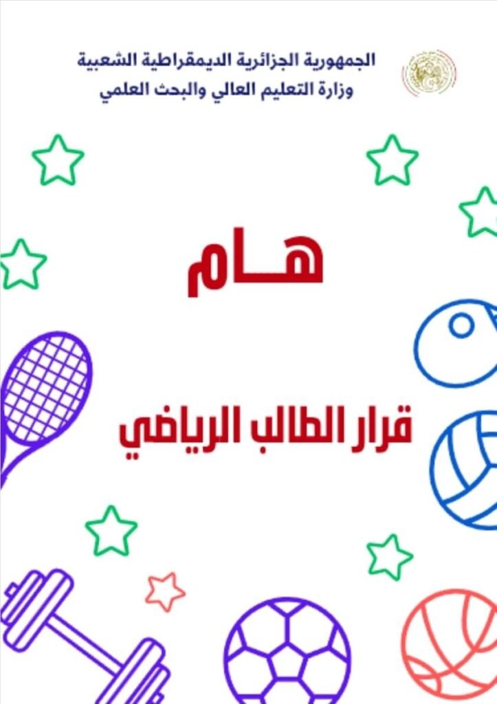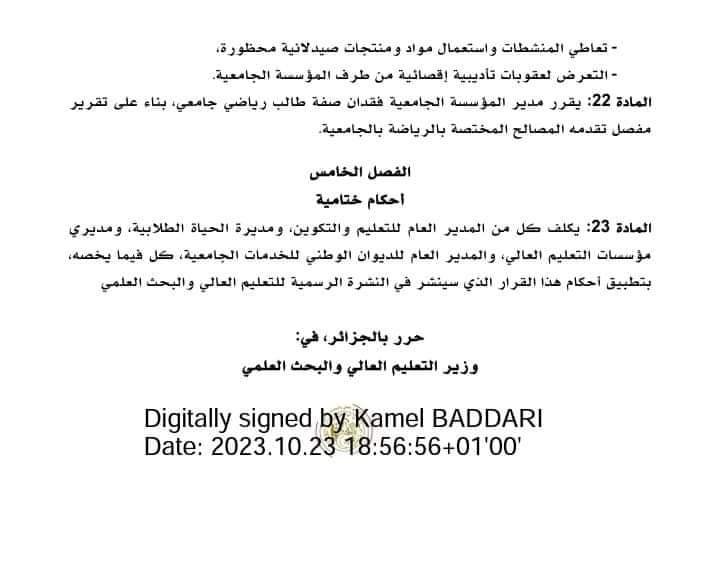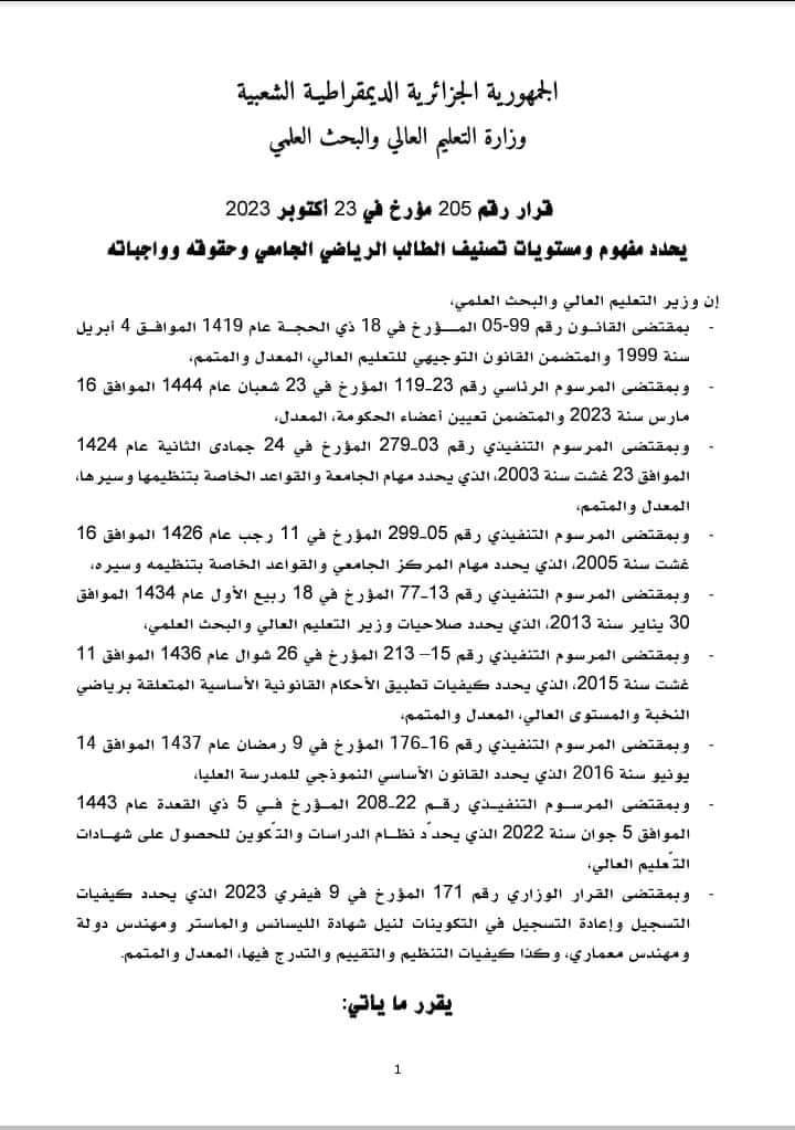 أصدر وزير التعليم العالي والبحث العلمي، كمال بداري، قرارا يحمل رقم :205 مؤرخ في: 23 أكتوبر 2023، يحدد مفهوم ومستويات الطالب الرياضي الجامعي وحقوقه وواجباته في 23 مادة .